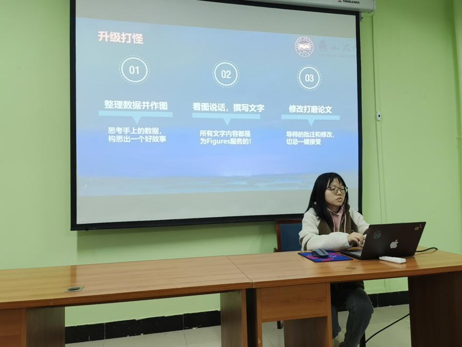 马丽想同学从研究生生活的整体规划切入,强调了科研方向选择与前期准备的重要性;她结合自身经历,分享了在科研中如何激发思考与创造力,以及在生活中如何平衡社交与压力管理。王奎月同学聚焦论文写作规范,系统讲解了学术论文的核心结构与撰写要点,并分享了数据整理与科研绘图的实用技巧;她以具体案例展现了科研工作的严谨性与科学性,帮助同学们提升学术表达与成果呈现的能力。刘此晗同学则从实验设计与过程记录的角度出发,介绍了高效开展实验的方法与经验,并分享了如何持续追踪学科前沿动态,不断拓展学术视野。