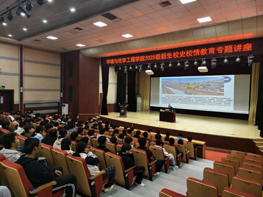 2025年10月18日环境与化学工程学院于西区大学生活动中心举办了2025级新生校史校情教育讲座。本次活动特邀燕山大学原党委副书记陈春利老师担任主讲,学院2025级全体新生及辅导员陈奕开、赵子璇老师共同参加了此次活动。