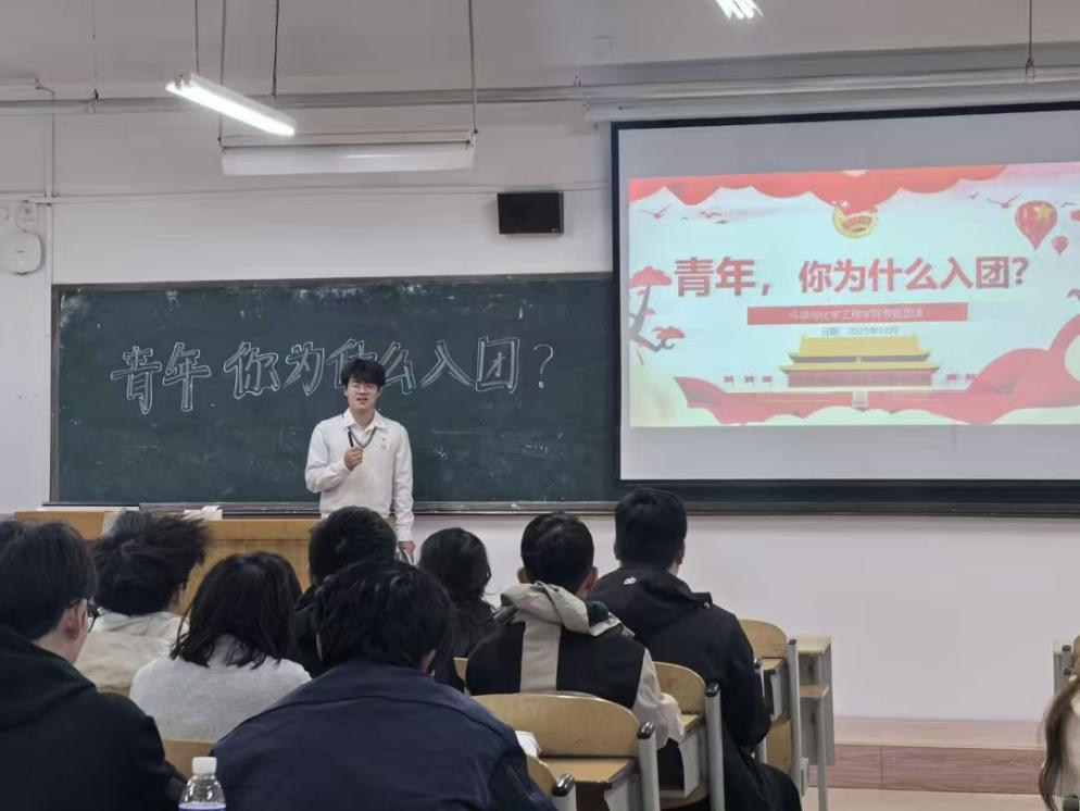 为帮助入团积极分子筑牢信仰之基、坚定入团初心,10月17日晚,环境与化学工程学院开展以“青年,你为什么入团”为主题的入团积极分子专题团课。本次团课邀请学院团委副书记陈雪涛老师主讲,本学期全体入团积极分子参加。