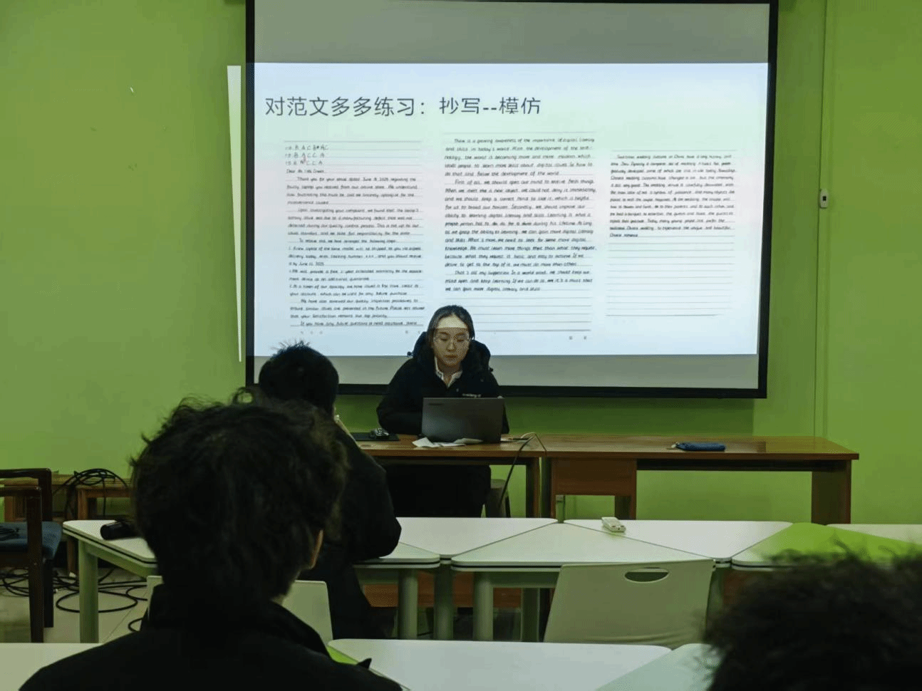 最后,学生讲师郝蕊解析了四六级写作的提分要点,强调书写规范的重要性,并介绍了“三段式结构”“句式升级”等实用技巧。讲解内容条理清晰、知识点详实,讲师的知识点串讲使同学们深受启发,讲座在积极的互动中顺利结束。