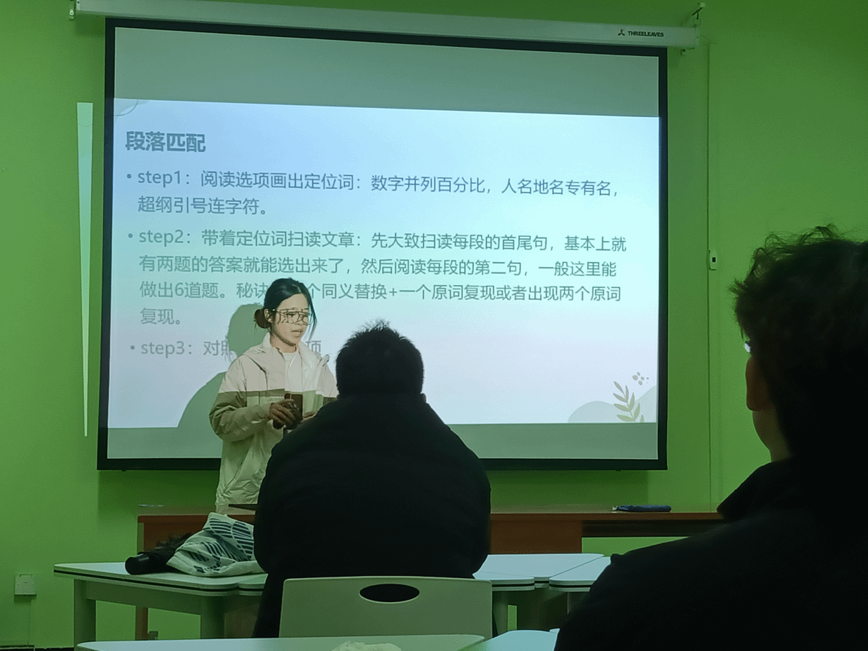 学生讲师王烨茜聚焦阅读部分,系统介绍了词缀的应用方法及关键词提取技巧;随后围绕听力部分,分享了精听训练的具体策略。整场讲解逻辑清晰、重点突出,帮助同学们对相关考点与备考方法形成了更系统的认识,大家纷纷表示收获颇丰。